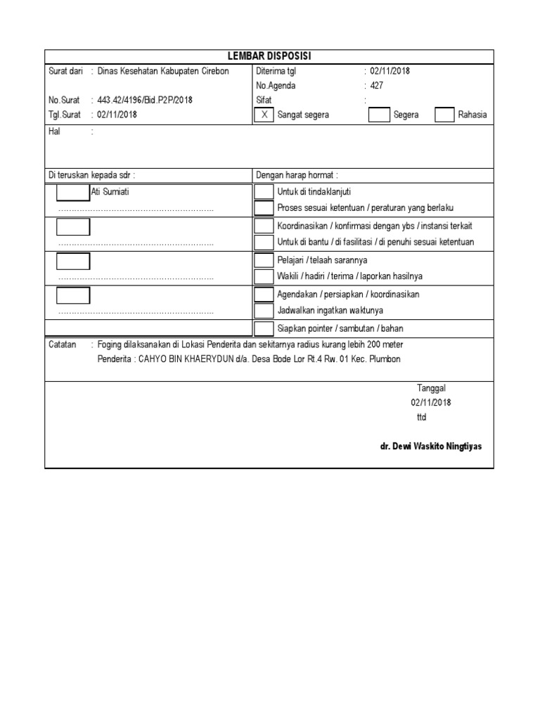 Aug 16, 2019 · format gambar contoh lembar disposisi surat doc terbaik 2019. The collection that consisting of chosen picture and the best amongst others. Jika hanya satu disposisi, mungkin tidak akan menjadi masalah. We would like to show you a description here but the site won't allow us. Orang yang ditunjuk oleh pimpinan untuk menindaklanjuti surat yang dimaksud akan menangani surat berdasarkan instruksi pimpinan tersebut.